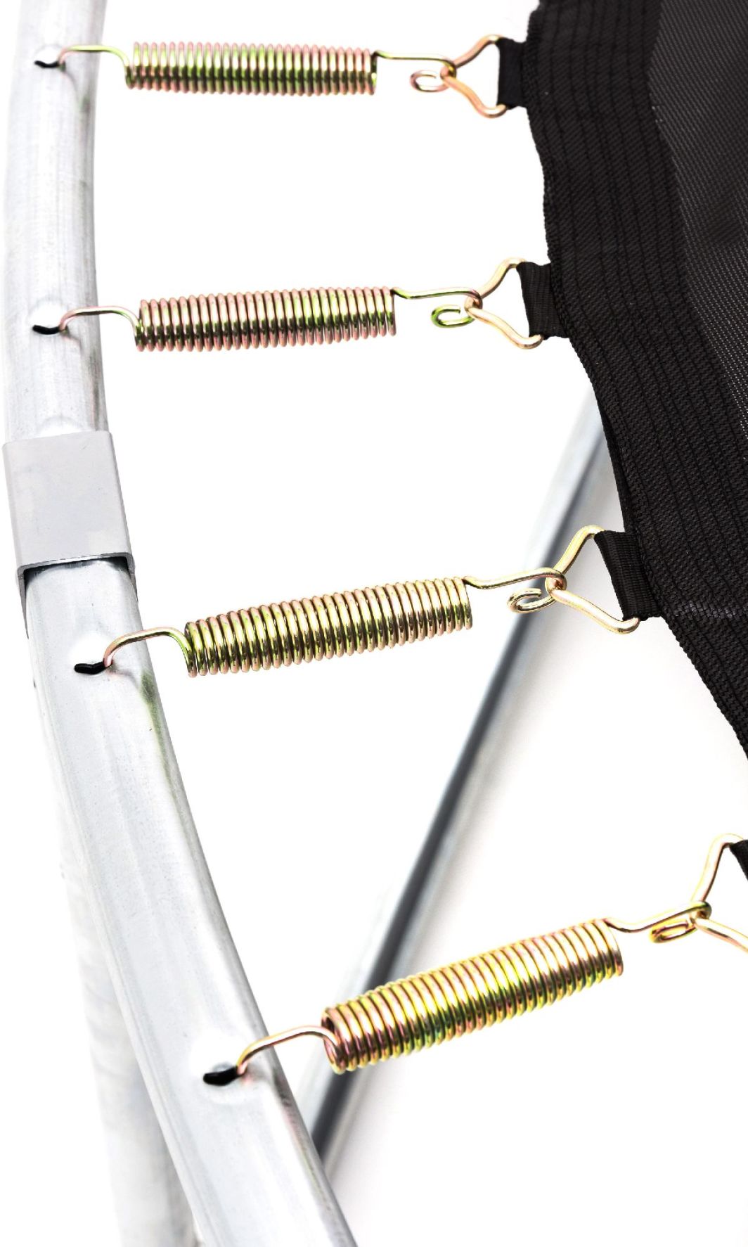 Jest to ten element trampoliny, który wpływa bezpośrednio na jakość skoków. Ważna jest nie tylko ich ilość, ale także sposób zamocowania do maty. Nie mają one prawa wysunąć się podczas treningu lub zabawy, więc ważne jest to czy są prawidłowo zaczepione. Powinny być masywne i solidne. Dodatkowo zabezpieczenie stanowić będą osłony na sprężyny. Są istotne jeśli chodzi o trampoliny z siatką zewnętrzną – dzięki temu nasza stopa nie dostanie się pomiędzy sprężyny i nie zostanie uszkodzona przez wystający hak. Materiał osłony powinien być trwały i wytrzymały na rozciąganie.