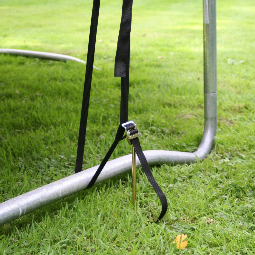 Można też zaopatrzyć się w dodatkowe akcesoria – kotwy do mocowania trampoliny w gruncie, co skutecznie chroni przed wiatrem i ewentualnymi zniszczeniami. Wkręcana kotwa i dodatkowo pasek stabilnie uziemiają trampolinę i zabezpieczają przed ryzykiem uszkodzenia spowodowanym przez warunki pogodowe. Kotwy zapobiegają też stopniowemu przemieszczaniu się trampoliny w czasie regularnego składania.