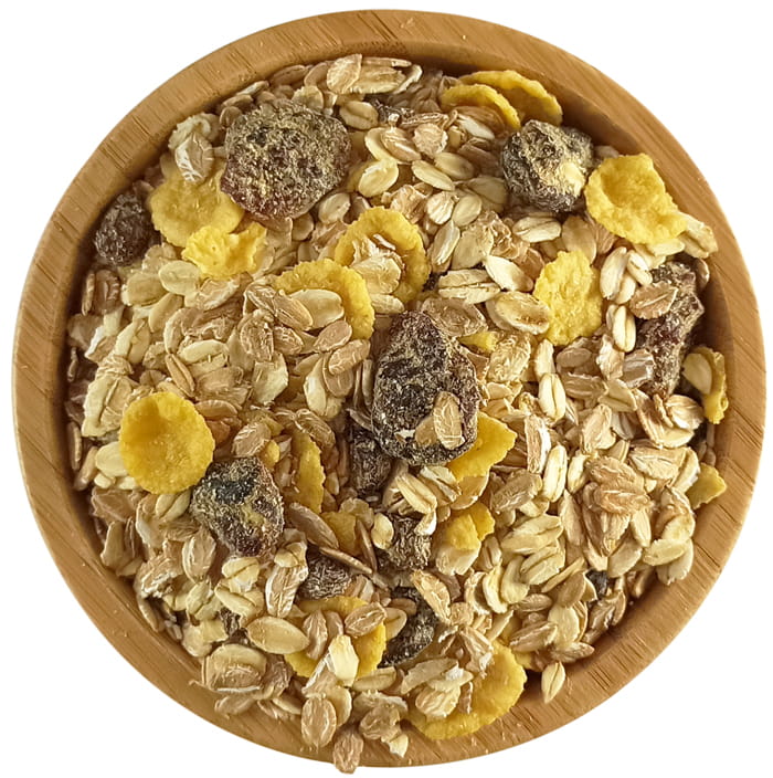 Skladniki: Płatki owsiane, płatki żytnie, płatki kukurydziane (kaszka kukurydziana, cukier, sól, ekstrakt słodowy z jęczmienia, regulator kwasowości: fosforany sodu), żurawina suszona (żurawina, cukier, olej słonecznikowy), rodzynki Thompson (rodzynki, olej roślinny)
