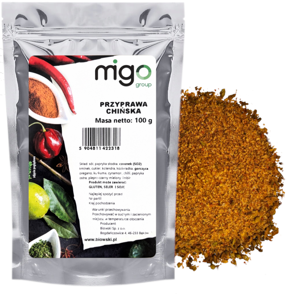 Przyprawa chińska to aromatyczna mieszanka inspirowana kuchnią azjatycką, zawierająca m.in. imbir, cynamon, kminek, oregano i pieprz. Nadaje potrawom charakterystyczny, lekko słodkawy i korzenny smak. Doskonale komponuje się z daniami z woka, mięsem, warzywami oraz ryżem czy makaronem. Jest idealna do smażenia, duszenia i marynowania składników w stylu orientalnym.