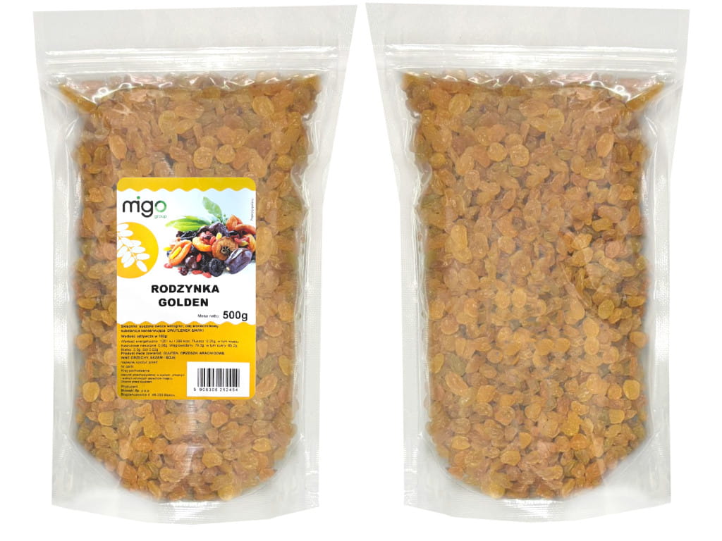 Rodzynka Golden, zwana również złotą rodzynką, pochodzi z jasnych odmian winogron, najczęściej Thompson Seedless, które są suszone na słońcu lub poddawane obróbce dwutlenkiem siarki, aby zachować swój złocisty kolor. Mają łagodniejszy smak i są słodsze od ciemniejszych rodzajów rodzynek. Dzięki swojej jasnej barwie są popularnym składnikiem w wypiekach, sałatkach oraz potrawach mięsnych, gdzie dodają naturalnej słodyczy. Często używane są również w kuchni śródziemnomorskiej oraz bliskowschodniej.